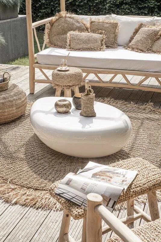 Ihastuttava boheemi Raffia jakkara. Jakkarassa on kaunis raffiasta kudottu istuinosa, jonka alaosassa hapsut.Jalat ovat tiikkiä. Sopii hyvin sisätiloihin tai katetulle terassille. Todellinen katseenvangitsija. Tiikki on luonnonmateriaali, joten ympöristön vaikutukset saatavat aiheuttaa ajanmyötä lohkeamia tai halkeamia puuhun. Pieniä koko- ja värisävy eroja voi tuoteessa ilmetä.