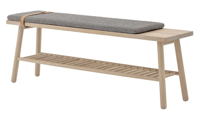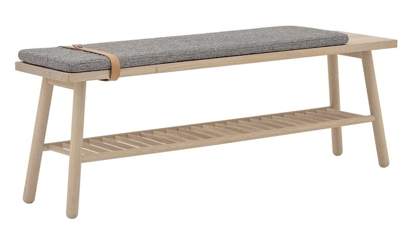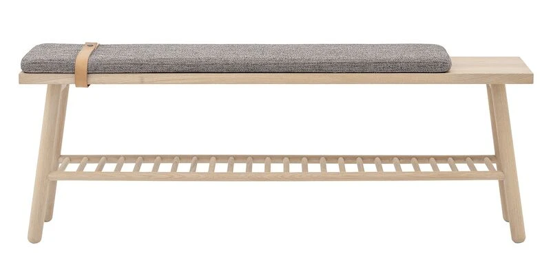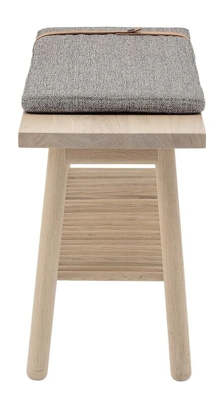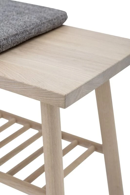 Laadukas penkki, jonka istuinosan alla on hylly esimerkiksi lehdille tai kengille. Penkki on väriltään luonnonvärinen. Materiaalina tammi. Mukana nahkahihnalla kiinnitettävä pehmuste. Pehmuste on verhoiltu laadukkaalla huonekalukankaalla. Kangas on 100 % polyesteriä, jonka martindale, eli hankauskestävyys on 48 000. Pehmusteen päällinen on irroitettavissa vetoketjun avulla ja pestävissä 40 asteessa. Päällisen voi silittää halutessaan matalalla lämmöllä, ei valkaisuaineita. Pehmusteen materiaali on polyuretaani.