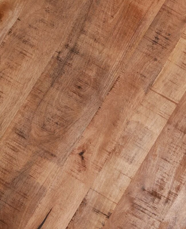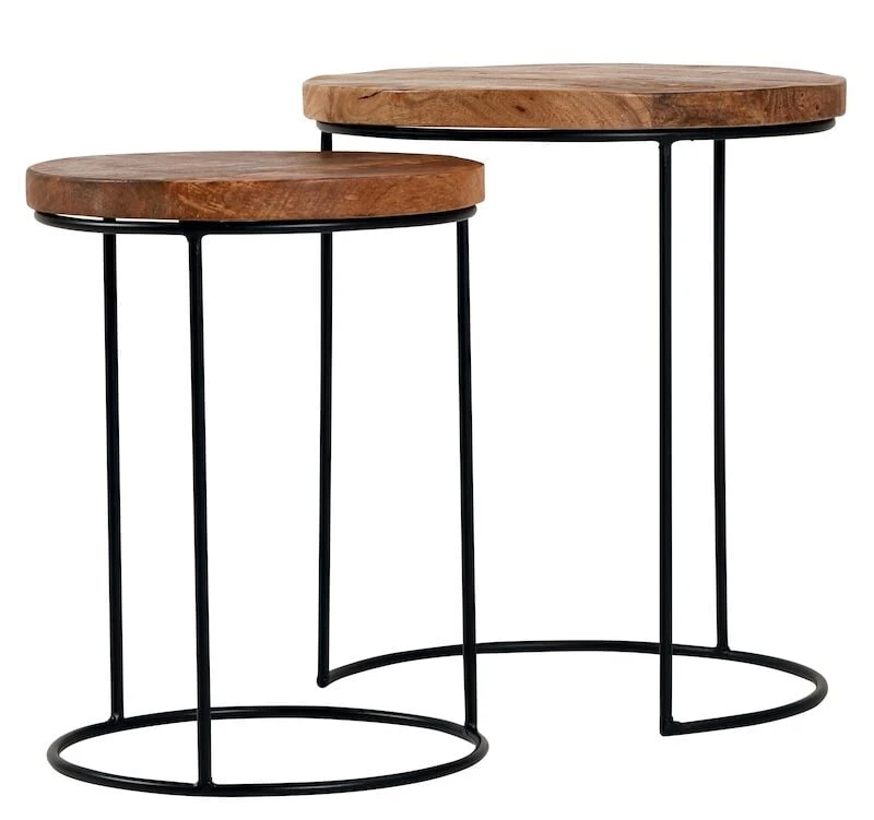 Näyttävä sarjapöytä kokonaisuus pyöreillä rungoilla ja rouheilla mangopuu kansiilla. Rungot on mustaksi maalattua metallia ja kannet mangopuuta. Pöydän kannet on ensin kevyesti lakattu ja sitten vahattu. Pöytien kansissa on hyvin eläväinen puun kuviointi. Mangopuu on luja puu, jonka ominaisuuksiin kuuluu värivaihtelut, yksilöllinen puunkuviointi ja erilaiset epätasaisuudet puun pinnalla. Pöydän kannet valmistetaan käsityönä, joten jokainen tuote on yksilöllinen. Pienemmän pöydän halkaisija on 35 cm ja korkeus 43 cm. Isomman pöydän halkaisija on 43 cm ja korkeus 50 cm. Pienempi pöytä menee isomman pöydän alle. Sisältää pienemmän ja isomman pöydän.