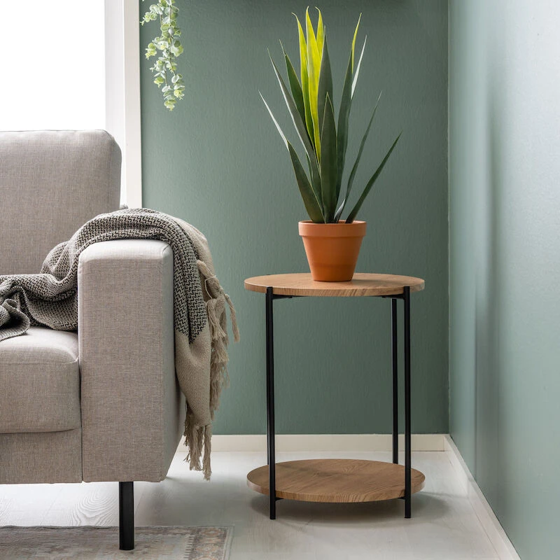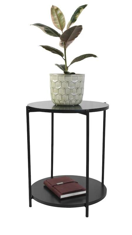 Kaunis, pyöreä Day apupöytä. Kannen ja hyllyn materiaalina on mdf, jossa on tammenvärinen pvc pinnoite. Jalat ovat metallia, jotka on jauhemaalattu mustaksi. Ohuiden jalkojen ansiosta ilme on kepeä ja siro. Pöydän halkaisija on 40 cm ja korkeus 50 cm. Pöytä toimii hyvin apupöytänä oleskelutiloissa tai esimerkiksi makuuhuoneessa yöpöytänä. Pöytä on osina paketissa, vaatii kasaamista.