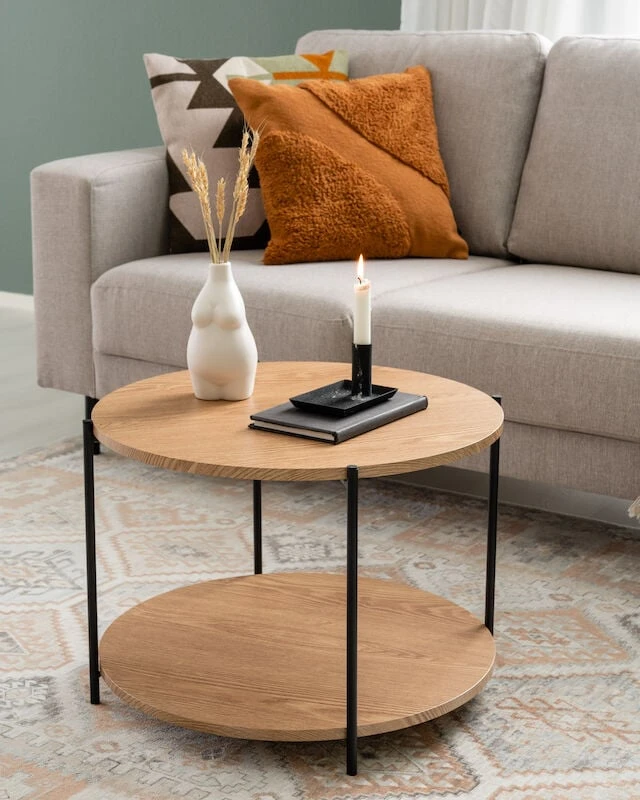 Tyylikäs pyöreä Day Retro sohvapöytä, jossa on sirot metalliset ja mustaksi maalatut jalat. Pöydän kannen alla toinen taso, joka toimii myös säilytystasona. Pöydän kansi on tammenvärinen. Kannen ja tason materiaali mdf-levyä, jossa on pvc-pinnoite. Pöydän halkaisija on 55 cm ja korkeus 40 cm.