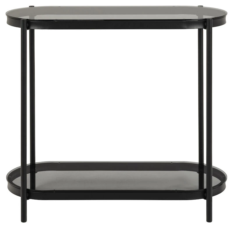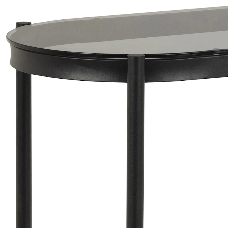 Bayonne sivupöytä on käytännöllinen lisälaskutaso esimerkiksi eteiseen tai olohuoneeseen. Ovaalin muotoisessa pöydässä on musta pulverimaalattu metallirunko ja kaksi savunharmaata lasitasoa.