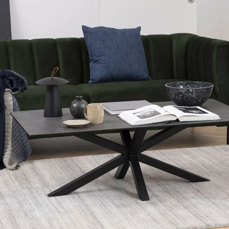 Moderni Heaven sohvapöytä tarjoaa runsaasti laskutilaa olohuoneeseen. Sohvapöydän linjakas, keraaminen kansi on eläväpintaista ja kestävää materiaalia, joka kestää hyvin kuumuutta eikä naarmuunnu herkästi. Voit siis laskea kahvikupposen turvallisesti pöydällä pelkäämättä jälkiä pöydän pinnassa. Veistoksellinen metallista valmistettu ristijalka on näyttävä elementti muutoin pelkistetyssä pöydässä.