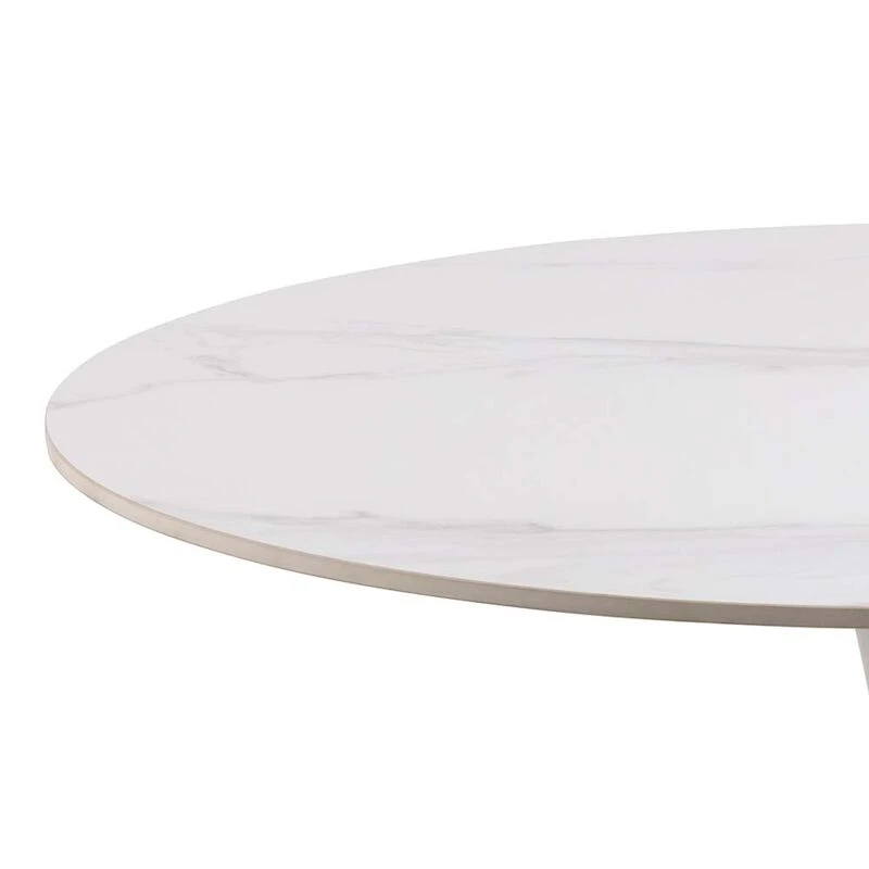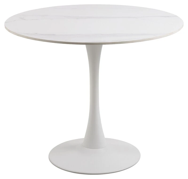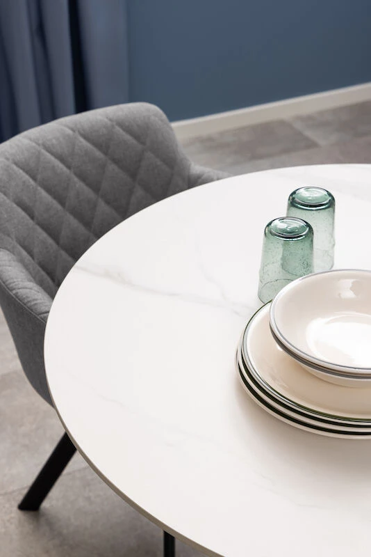 Tyylikäs ja moderni ruokapöytä sopii pieneen keittiöön tai ruokailutilaan. Pöydän halkaisija on 90 cm, mutta pöydän ympärille mahtuu kuitenkin hyvin 4 tuolia. Keskelle sijoitettu metallinen trumpettijalka antaa hyvin tilaa tuolien sijoittelulle. Pöydän tyylikkäästi kuvioitu, keraaminen kansi on helppo pitää puhtaana eikä se naarmuunnu herkästi.