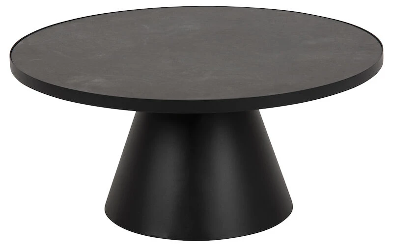 Soli sohvapöydän pyöreä pöytälevy sopii täydellisesti mustan jalkaosan kanssa luoden modernin kokonaisuuden. Pöydän kaunis, vaalea kansi on kiillotettua Guangxi-marmoria. Tyylikäs musta kansi harmailla vivahteilla on Fairbanks-keramiikkaa. Kuumuutta ja naarmuuntumista kestävä keraaminen pöytätaso vaatii vain vähän huoltoa. Pöydän tukeva trumpettijalka on mustaksi puleverimaalattua metallia.