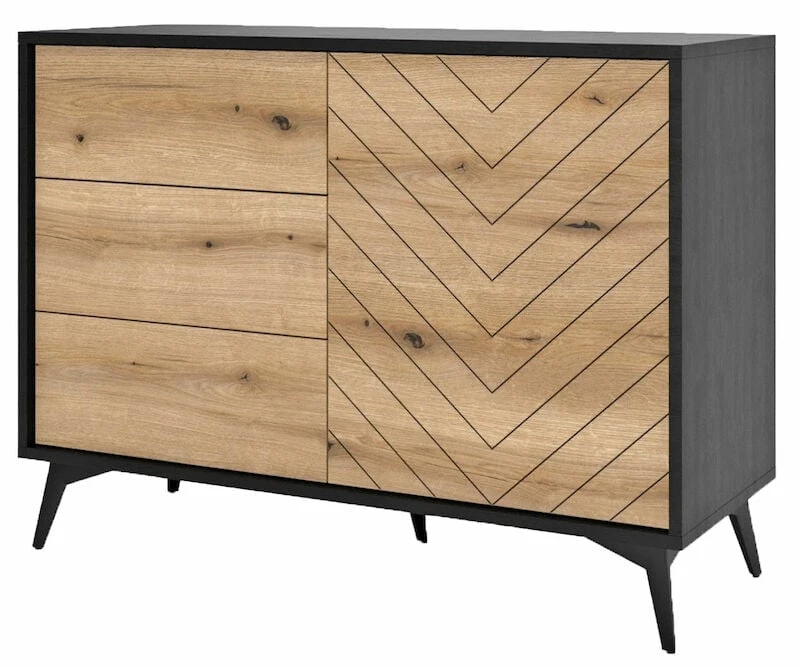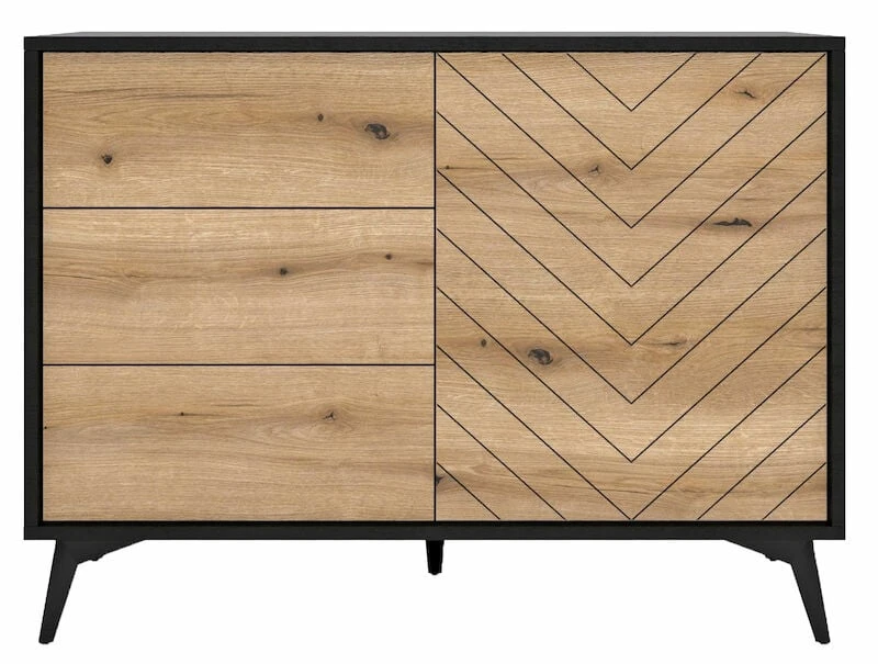 Tyylikäs ja näyttävä Dumont lipasto kaapilla ja kolmella laatikostolla. Lipaston etusarjat ovat tammen väriset, runko ja jalat ovat mustat. Kaapin ovessa kaunis koristeellinen kuviointi. Laatikoissa ja kaapissa push-to-open mekanismi. Yhdistämällä muihin tuotteisiin saat kauniin kokonaisuuden.