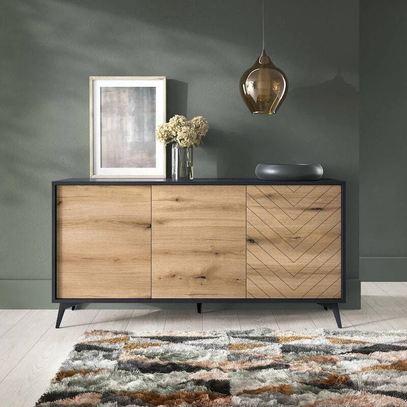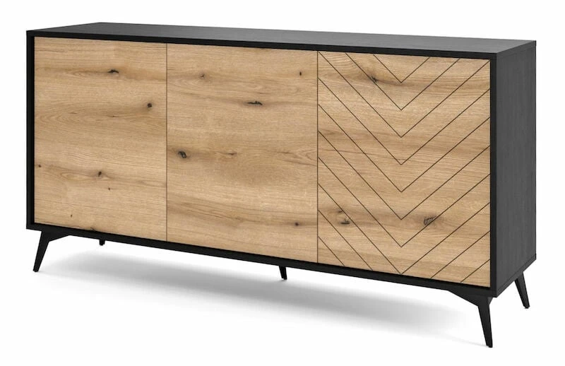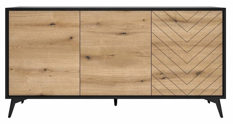 Kaunis ja näyttävä Dumont senkki, jossa on runsaasti säilytystilaa. Ovien takana kolme erillistä kaappia, joissa jokaisessa on yksi välihylly. Ovissa push-to-open –mekanismi. Musta runko ja tammen väriset ovat. Oikean puoleisessa ovessa on koristeellinen kuviointi. yhdistä muihin tuotteisiin.
