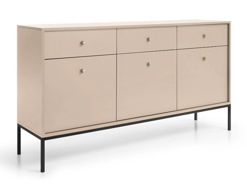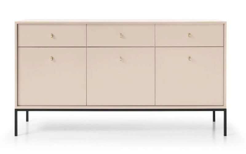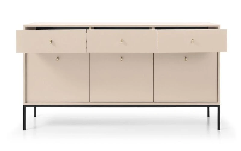 Senkin korkeat metallijalat antavat sille ilmavan ja kevyen ilmeen samalla tuoden kauniin kontrastin senkin kokonaisuuteen. Kullanväriset metallivetimet tuovat ripauksen luksusta ja lisäävät senkin hienostunutta ulkonäköä.