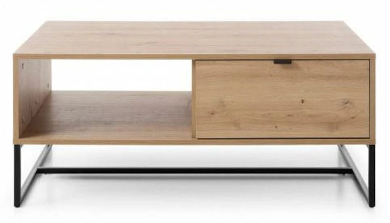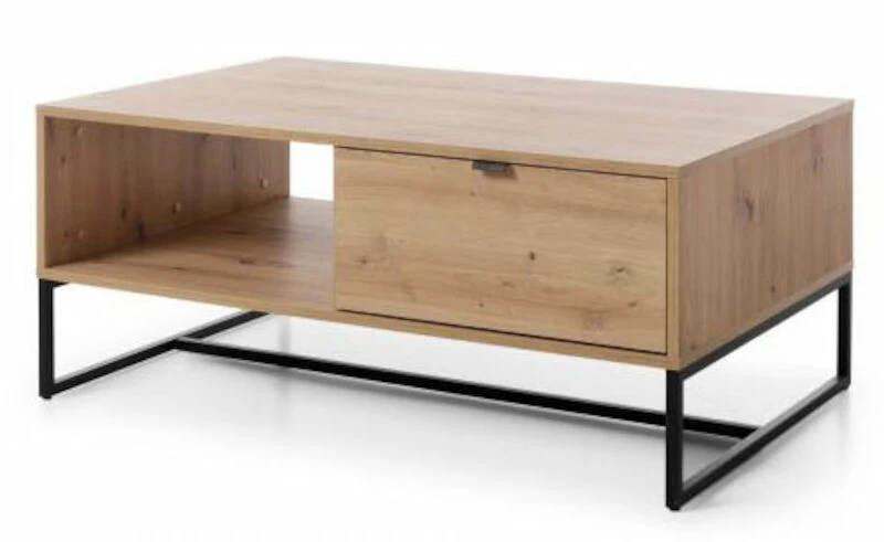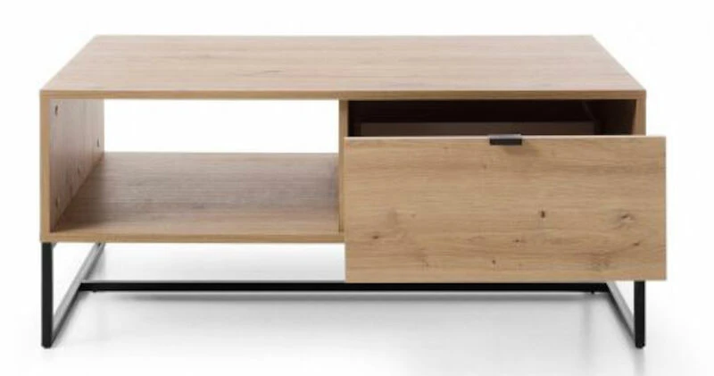 Tyylikäs Fore sohvapöytä kauniina tammenvärinä. Sohvapöydän runko on laminoitua kalustelevyä. Musta metallijalka ja laatikon vedin viimeistelevät tyylikkään kokonaisuuden. Sohvapöydässä on avohylly ja yksi vetolaatikko.