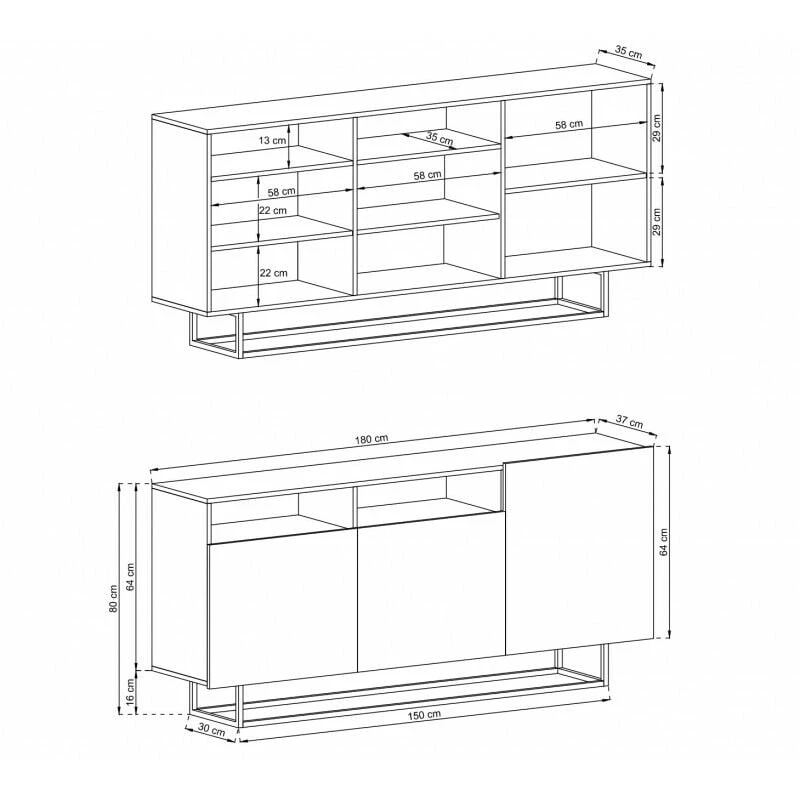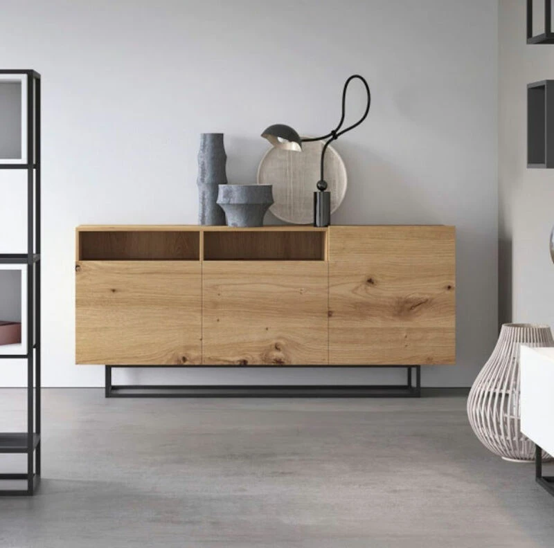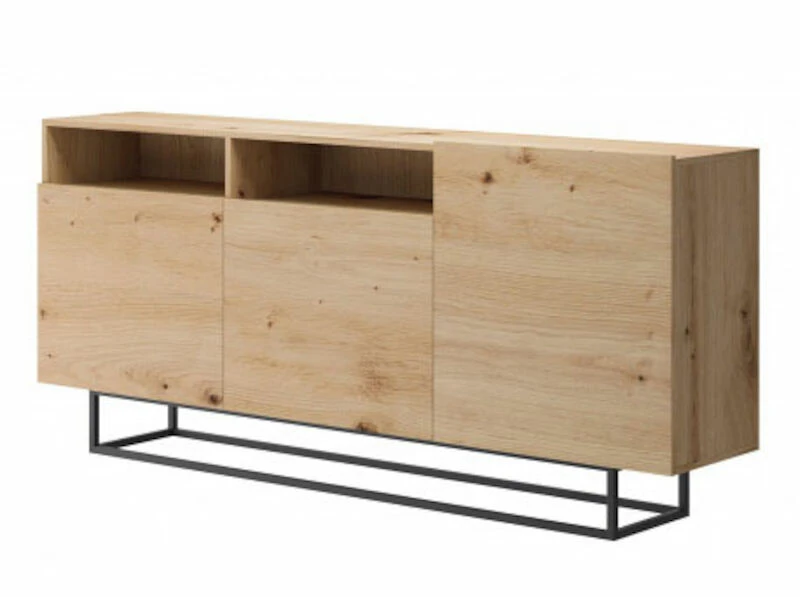 Ihastuttavan selkeälinjainen Jalo senkki mustalla metallisella jalkaosalla. Senkissä on reilusti säilytystilaa niin avohyllyissä, tasolla kuin kaapeissakin. Runko laminoitua kalustelevyä.