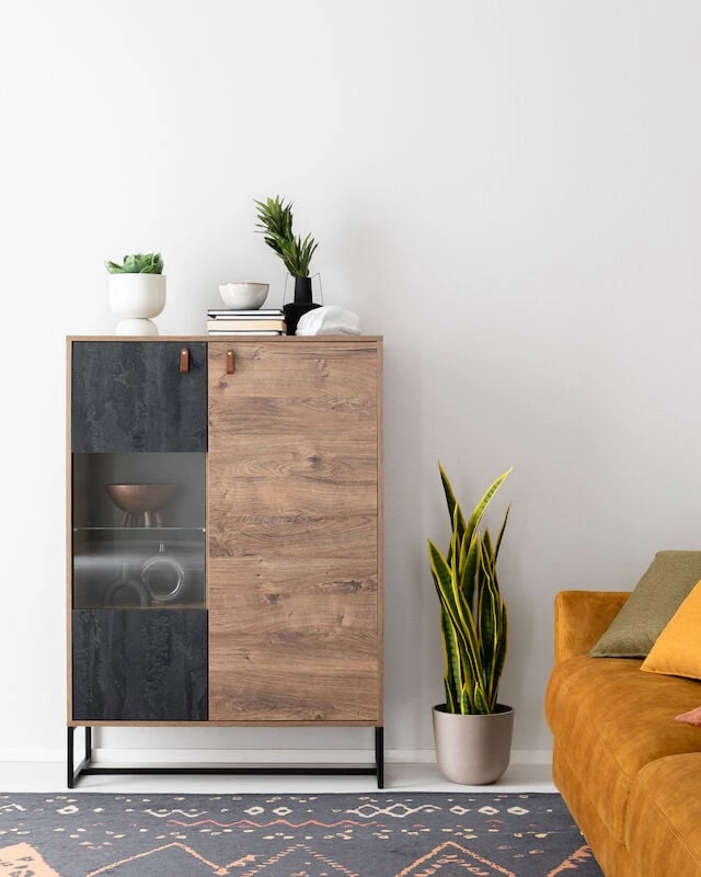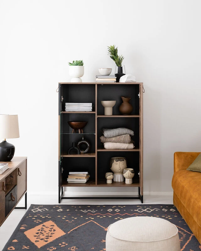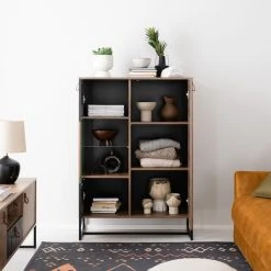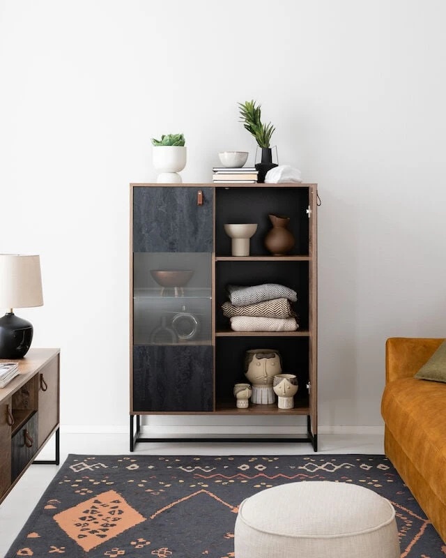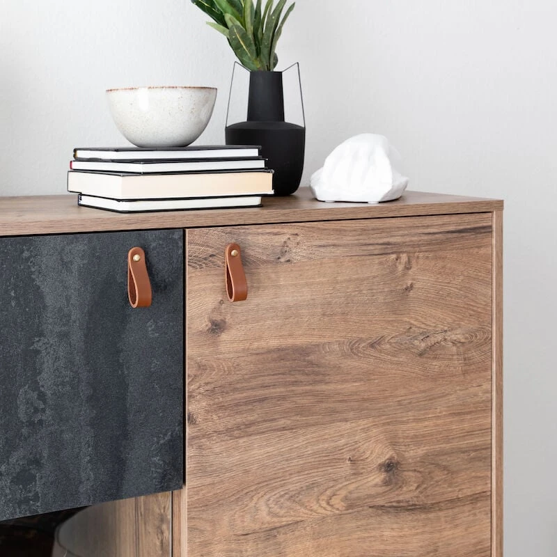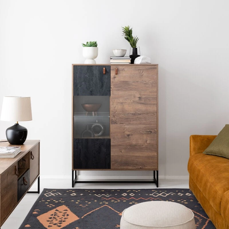 Tyylikäs Skandinaaviseen sisustukseen sopiva metallijalkainen Kero vitriini. Käytännöllinen ja kaunis mihin tahansa kodin tilaan, sisällä hyvin säilytystilaa. Vitriinissä tammen värinen 16mm laminoitu kalustelevyrunko. Harmaa kaapin etusarja antaa hienon kontrastin tammenväriseen runkoon ja ruskeat nahkavetimet viimeistelevät kokonaisuuden. Musta metallinen jalka-osa keventää ilmettä, korkeus 18 cm. Vitriinissä karkaistulasiovi, jonka takana keskellä yksi lasihylly ja kaksi välihyllyä. Oikean oven takana kaksi välihyllyä. Vitriinin syvyys 35 cm ja hyllyt eri korkeuksilla, joten säilytystila vaihtelee hyllykohtaisesti.
