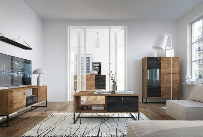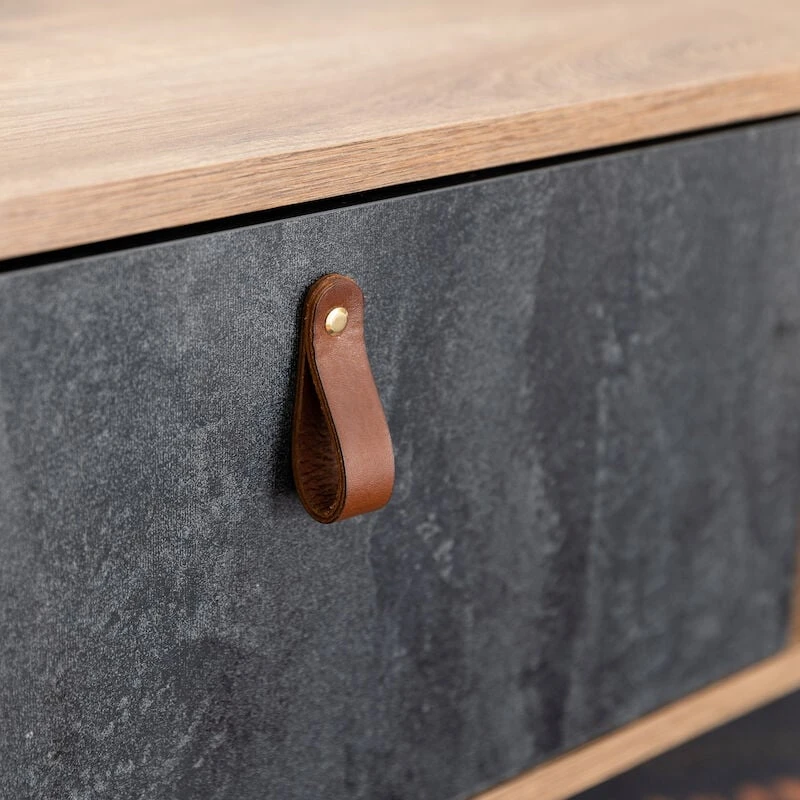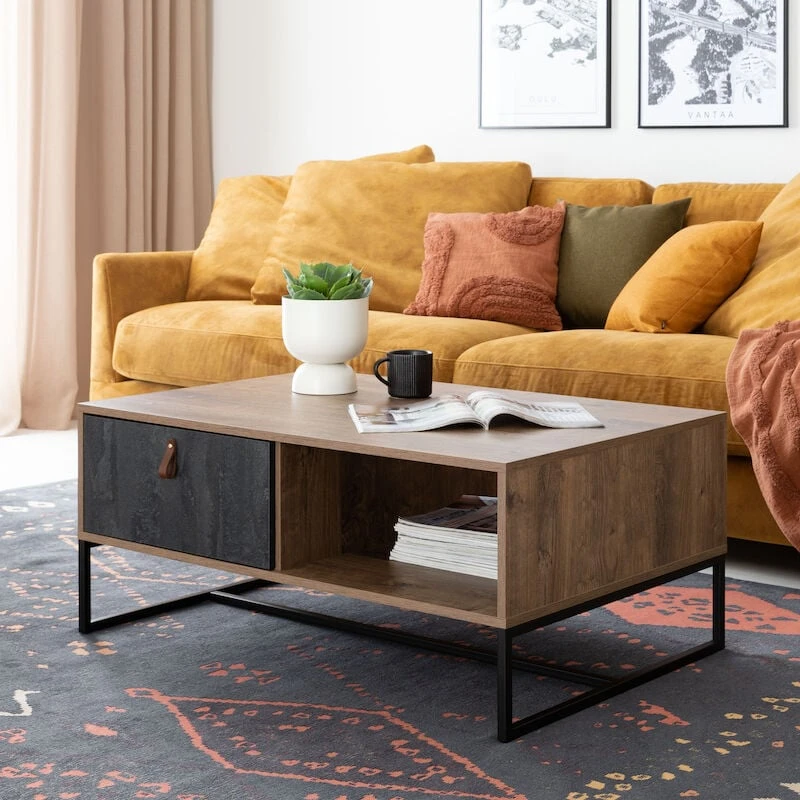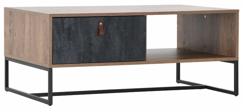 Sohvapöydässä on tammen värinen 16 mm laminoitu kalustelevyrunko. ja Harmaa laatikon etusarja antaa hienon kontrastin tammenväriseen runkoon ABS-reunanauhalla. Mustat 18 cm metallijalat antavat ilmavan ja kepeän ilmeen. Sohvapöytä sisältää avohyllyn ja laatikon ruskealla nahkavetimellä.