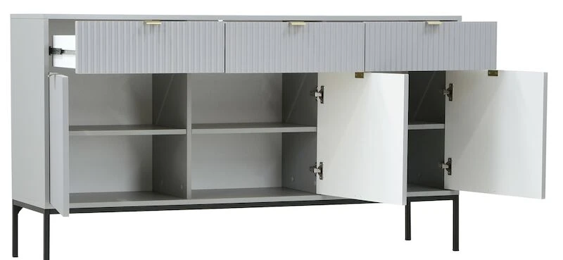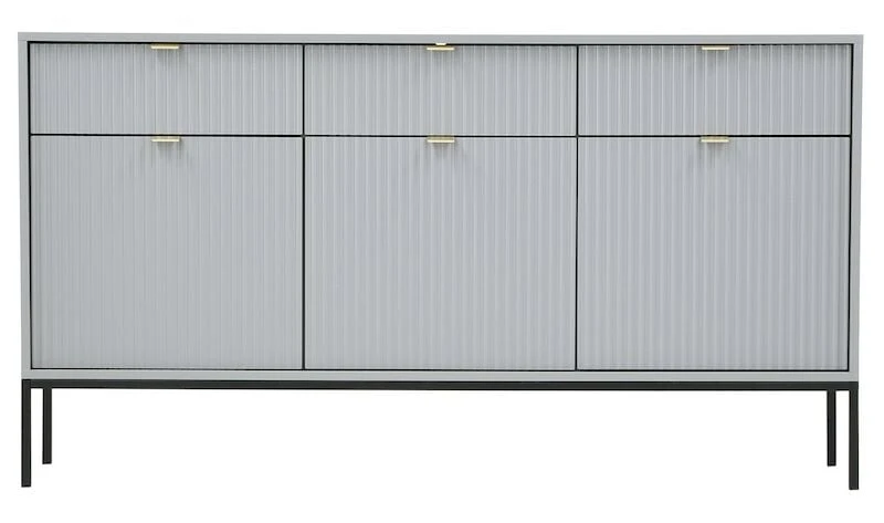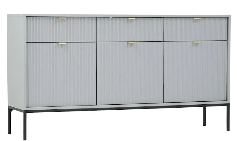 Tyylikäs Latte senkki sisältää runsaasti säilytystilaa. Senkistä löytyy kolme vetolaatikkoa sekä kolme säilytyskaappia, joissa jokaisessa on välihylly. Senkin runko on 16 mm paksua laminoitua kalustelevyä, jossa on ABS-reunanauha. Mustat 20 cm korkeat metallijalat tuovat senkille siron yleisilmeen. Laatikoiden ja ovien etusarjat ovat 18 mm paksua mdf-levyä ja niissä on harjatut kullanväriset alumiinivetimet. Etusarjoissa olevat urat antavat senkille persoonallisen ilmeen, joka toistuu kaikissa tyylikkään tuotteissa.
