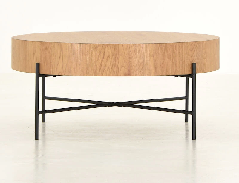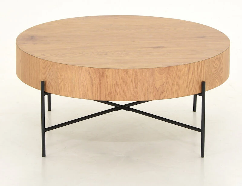 Mason sohvapöytä on näyttävä kokonaisuus. Modernit jalat näyttävää mustaksi maalattua metallia ja kansi tammenvärinen. Kansi MDFää ja paperiviilua. Pöydän halkaisija on Ø80cm.