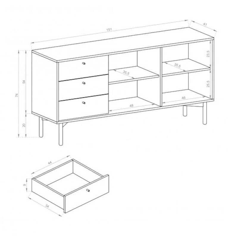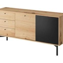 Linjakas korkeajalkainen Tuuli senkki. Käytännöllinen ja kaunis mihin tahansa kodin tilaan. Sisällä on hyvin säilytystilaa niin liinavaatteille kuin kansioillekin, päälle saat kauniit kodin koriste-esineet esille. Senkissä on tammen värinen 16 mm laminoitu kalustelevyrunko ja musta ovi ABS-reunanauhalla. Kauniit 20 cm korkeat mustaksi maalatut puujalat helpottavat siivousta sekä antavat kauniin ja kepeän ilmeen. Senkki sisältää kolme vetolaatikkoa ja kaksi kaappia yhdellä välihyllyllä. Oikean puoleisessa ovessa push-to-open mekanismi.