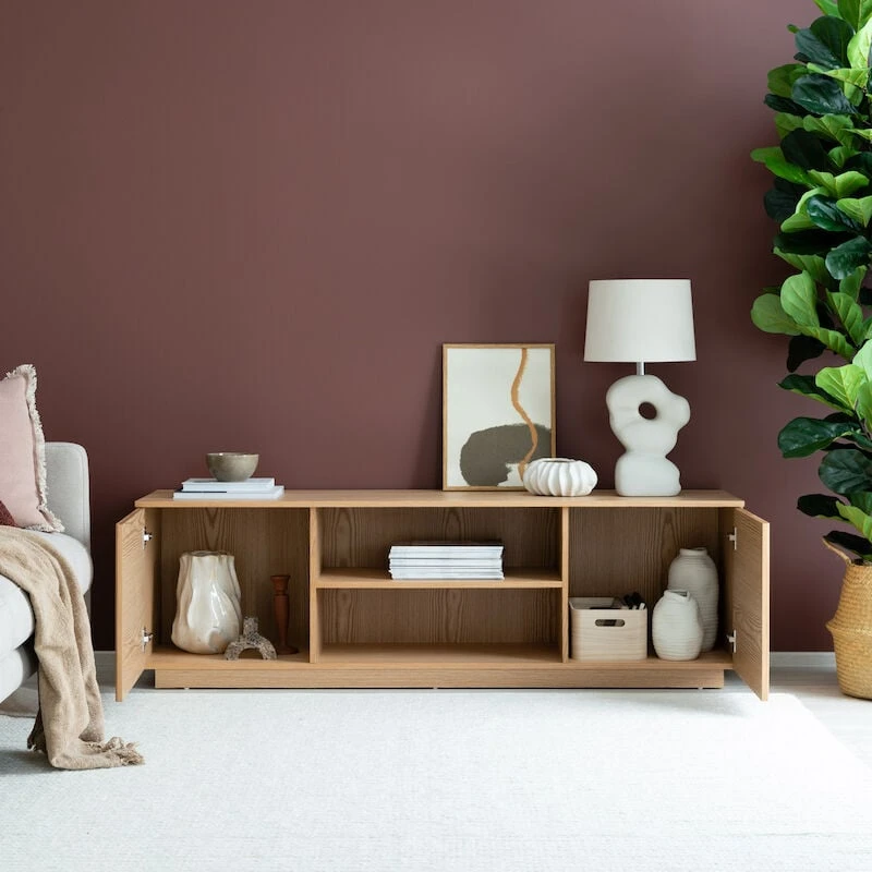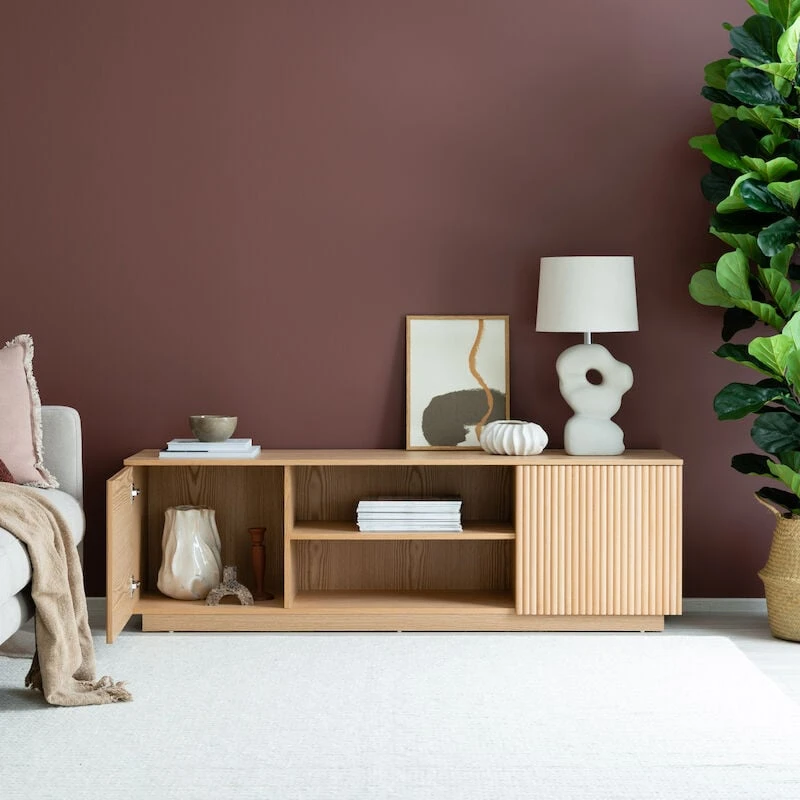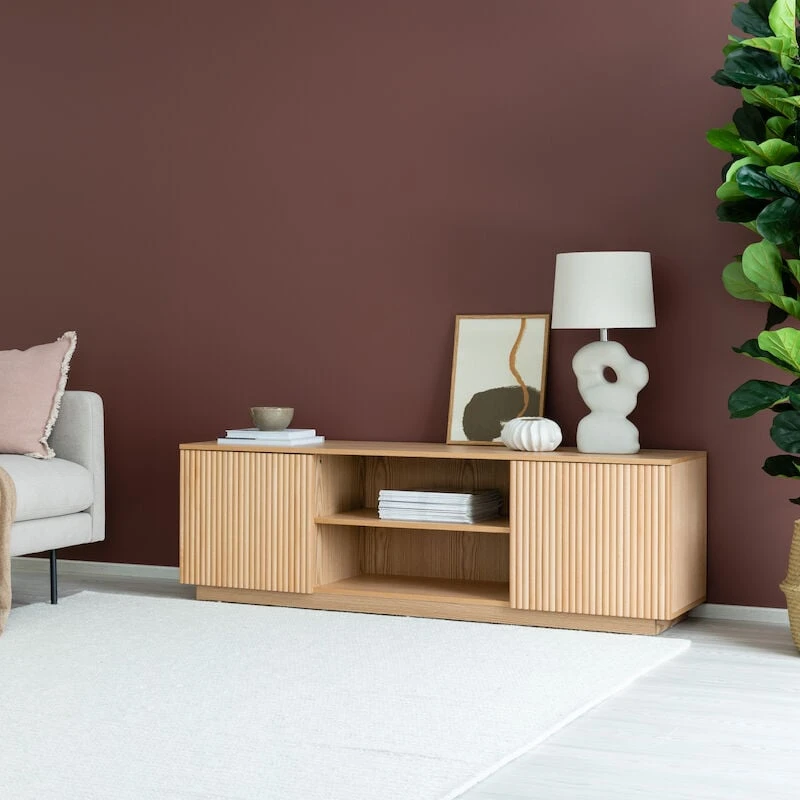kuuluvan tyylikkään tv-tason ovia koristaa kauniit pyökkirimat. Puunsävy ja orgaaniset muodot tuovat lämpöä ja kodikkuutta sisutukseen, olipa oma tyyli sitten rohkean värikäs taikka hieman hillitypi. Tv-tason keskellä on avohyllyt ja reunoilla kaapit. Runko on mdf-levyä ja tammiviilua. Hyllyjen keskellä on paikka johtojen läpiviennille.