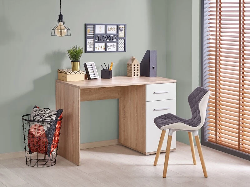 Perinteinen Aalto työpöytä laatikolla ja kaapilla. Valmistettu pinnoitetusta kalustelevystä. Kaapin sisällä yksi hyllytaso. Kätisyys ei ole vaihdettavissa.