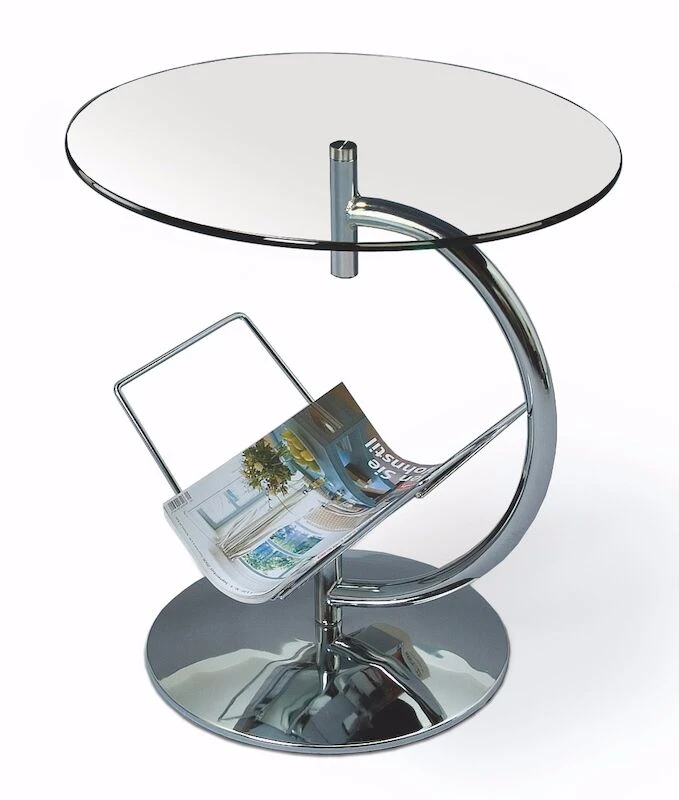Alma sivupöytä on todella kevyen ja ilmavan näköinen muotokieleltään. Näyttää, kuin sen karkaistu lasinen kansi lähes leijuisi kromisen jalkaosan päällä. Pöydän alaosassa on säilytyspaikka lehdille ja kodin muille papereille.