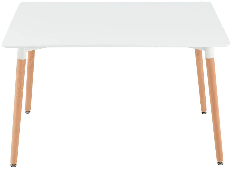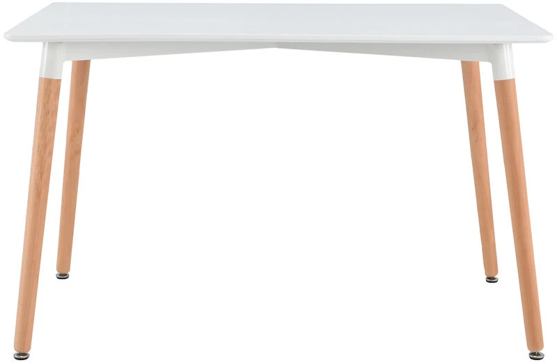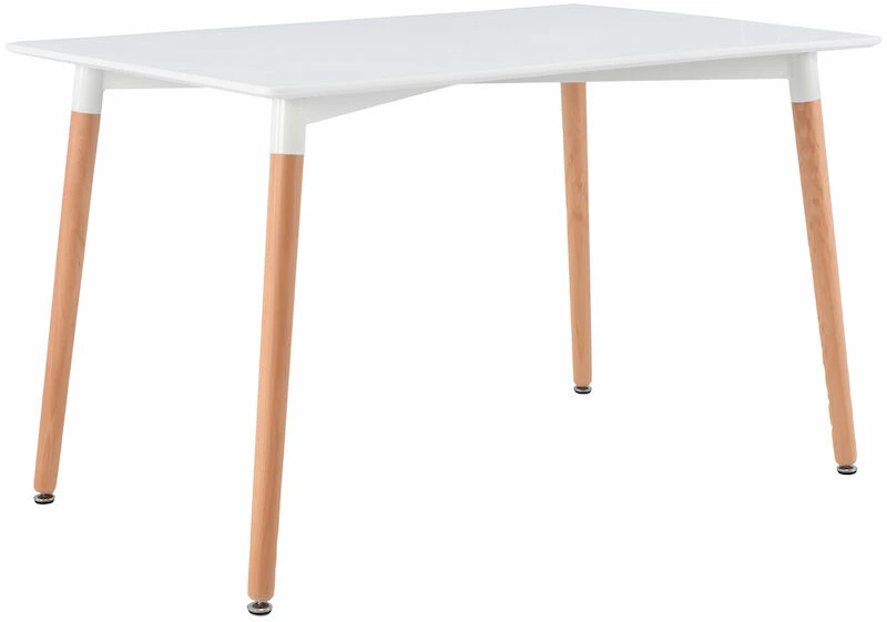 Tyylikäs ja siro ruokapöytä puun värisillä jaloilla.. Kansi valkoiseksi maalattua MDF-levyä. Jalat valmistettu puusta. Pöydän leveys 80 cm, pituus 120 cm, korkeus 74 cm. Kuvassa näkyvät tuolit eivät kuulu mukaan toimitukseen.
