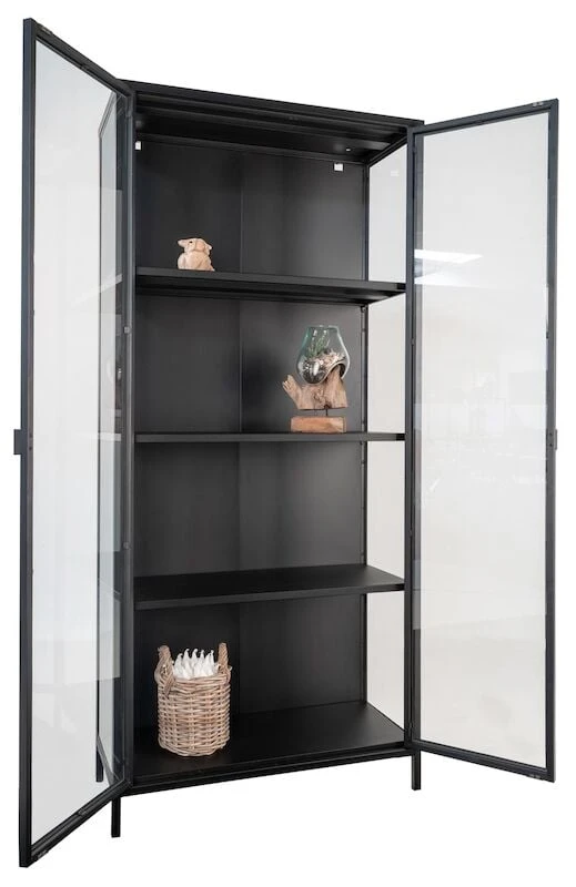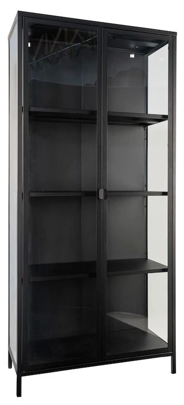 Tyylikkääs mattamusta House Nordic Brisbane korkea vitriini. Tähän vitriiniin saat kauniisti esille esimerkiksi koriste-esineet, astiat ja valokuvat. Vitriinin runko, hyllyt, takaseinä ja ovien kehykset on mustaksi pulverimaalattua terästä. Vitriinin sivuilla ja ovissa on kirkas lasi. Lasin vahvuus 4,35 mm. Vitriinin kolme hyllylevyä ovat säädettävissä kolmeen eri korkeuteen.