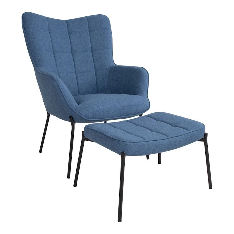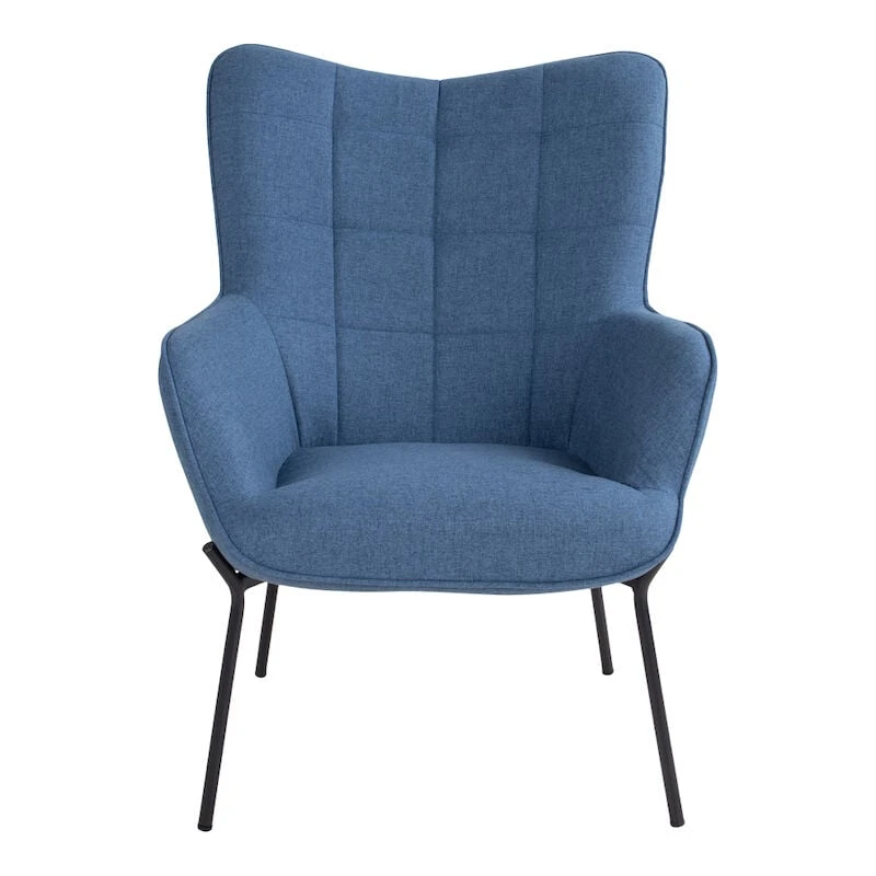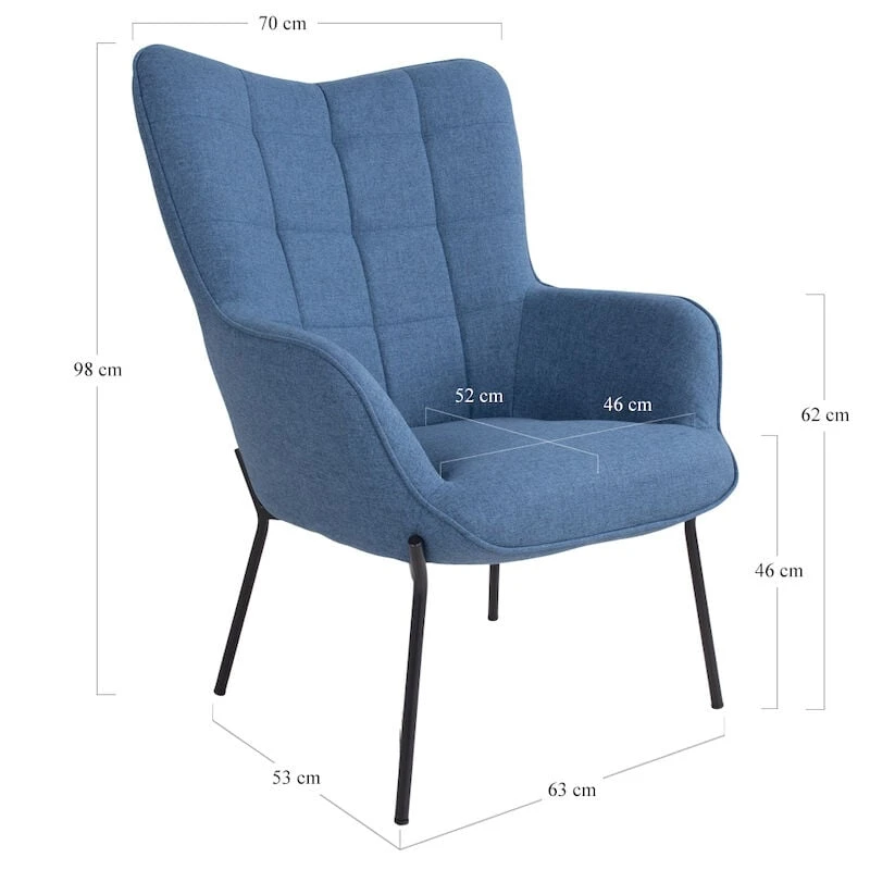 Tyylikäs nojatuoli moneen tilaan. Tuolissa on kestävä polyester-kangasverhoilu ja mustaksi maalatut metallijalat. Selkänojassa olevat kauniit tikkaukset luovat tuoliin viehättävän yksityiskohdan. Kuvissa oleva rahi ei sisälly hintaan.