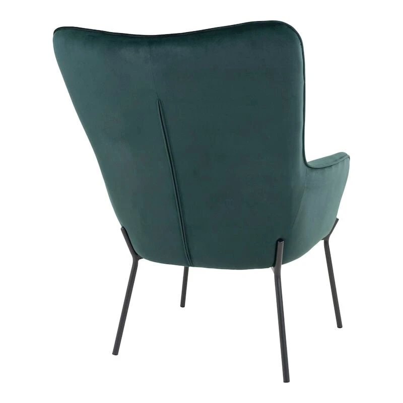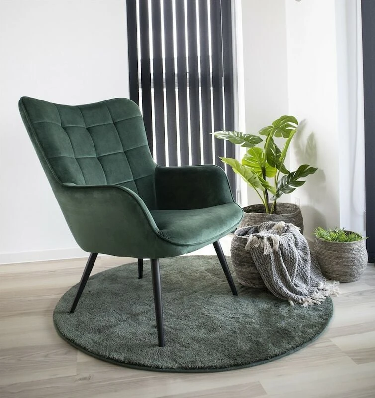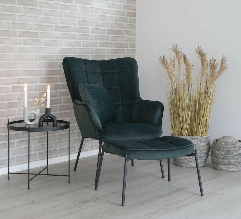 Tyylikäs nojatuoli moneen kodin tilaan. Tuolissa on kaunis samettiverhoilu ja tyylikkäät mustaksi maalatut metallijalat. Selkänojassa olevat kauniit tikkaukset luovat tuoliin viehättävän yksityiskohdan.