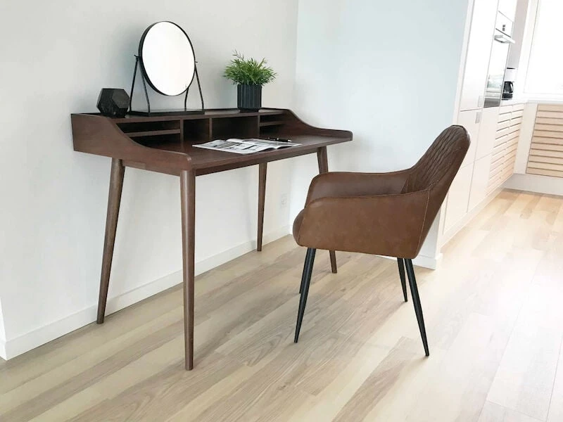 Kaunis House Nordic Hellerup työpöytä. Materiaalina MDF ja pähkinäviilu. Työpöydässä on käteviä lokeroita säilytystä varten. Tumma pähkinän sävy tekee pöydästä elegantin, sirot jalat tuovat ilmavuutta.