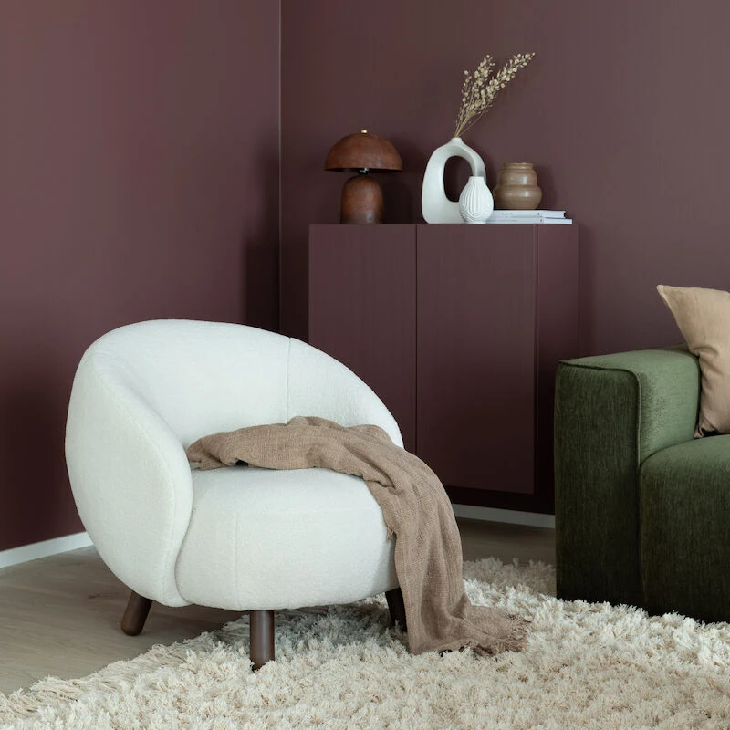 House Nordic Savona nojatuoli on kaunis ja moderni nojatuoli. Upeassa muotokielessä on lempeän pyöreitä muotoja, jotka sopivat ajan henkeen täydellisesti. Tuoli on verhoiltu keinotekoisella lampaannahkaa jäljittelevällä kankaalla, joka on polyesteriä ja ihanan pehmeä. Savona tuo tilaan pehmeyttä ja trendikästä japandi sisustustyyliä.