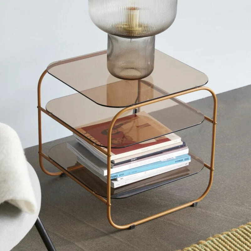 Hübschin Echo apupöytä on klassisen näköinen, tuotu mummolasta 2020-luvulle kauniilla materiaali- ja väriyhdistelmillä. Pöytätasot ovat lasia ja runko metallia. Sopii hyvin sohvan tai nojatuoliin, tai jopa yöpöydäksi. Välitasoille saat kauniisti esille aikakausilehtiä ja ylimmälle lukuvalaisimen. Hyllyjen väliin jäävä tila on 12cm. Hyllyjen mitta on 41x41cm ja ne ovat 5mm paksuja.
