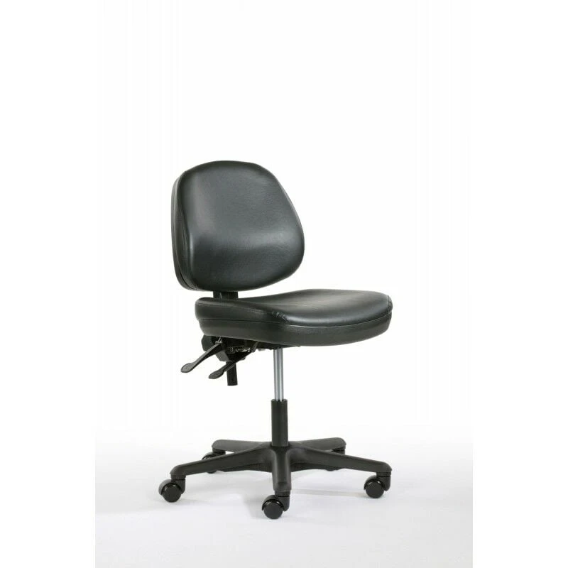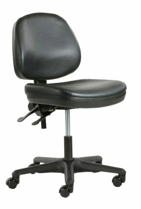 Laboratorioihin ja teollisuuteen tarkoitettu INDY 3 eco työtuoli pehmeällä mustalla keinonahkaverhoilulla. Korkeudensäätö kaasujousella, istuimen kaltevuuden säätö. Ergonomisesti muotoiltu istuin takaa, että tuolissa viihtyy pidemmänkin aikaa. Pehmeät PU-pyörät tarkoitettu koville lattiapinnoille.