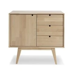 Ajaton ja erittäin laadukas Kiteen Notte senkki. Materiaalina massiivikoivu, väreinä koivu ja valkoiseksi maalattu, jossa koivun väriset jalat. tuotesarjan tuotteet ovat siroja ja niissä on kauniita yksityiskohtia. Tuotesarja on kotimainen ja se on valmistettu Kiteen Huonekalutehtaalla. Notte senkissä on kaksi kaappia joissa molemmissa on yksi säädettävä hyllylevy. Keskellä on kolme leveää laatikkoa laadukkailla metallisilla kuulalaakeroiduilla liukukiskoilla.