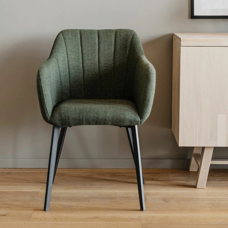 Upea Rowico Bolton tuoli kangasverhoiltuna ja pehmustetulla istuinosalla. Verhoiltu laadukkaalla huonekalukankaalla, jonka hankauskestävyys, eli martindale on 50 000. Kankaan materiaali 100 % polypropeenia. Tuolissa tyylikkäät mustaksi maalatut metallijalat.