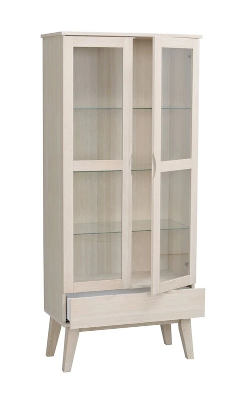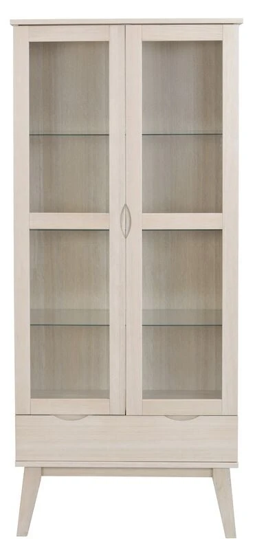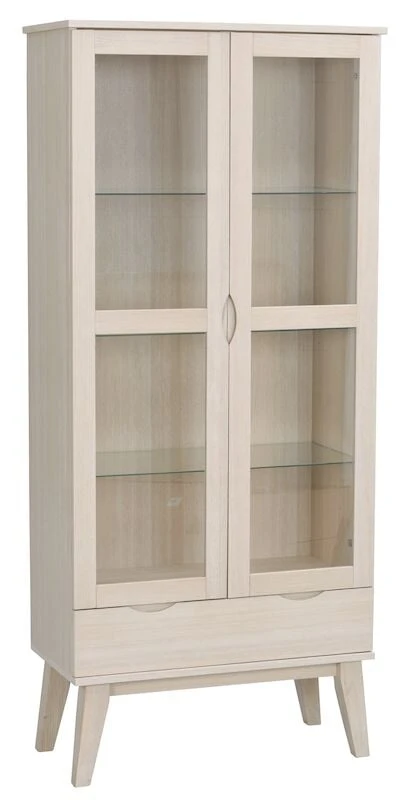 Laadukas ja tyylikkäästi muotoiltu Filippa vitriini. Materiaalina tammiviilu ja tammi. Vitriinissä on puukehyksiset lasiovet lasihyllyillä, alaosassa yksi laatikko. Hyllyjen korkeutta voidaan säätää kolmeen eri kohtaan. Laatikko sulkeutuu hitaan pehmeästi. Vitriiniin saa kauniisti esille astiat ja koriste-esineet. Korkeat, viistomaiset jalat keventävät ilmettä ja helpottavat siivousta. Kaatumisen estämiseksi kiinnitä vitriini seinään. Valitse kiinnikkeet seinämateriaalisi mukaan, seinäkiinnikkeet eivät kuulu mukaan toimitukseen.