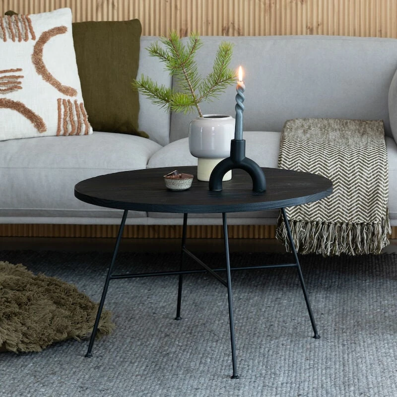 Tyylikäs, kokomusta Grafton -sohvapöytä on ajaton valinta olohuoneeseen. Pöydän pinnassa näkyy kaunis puukuvio, metallijalat tekevät pöydästä ilmavan näköisen.