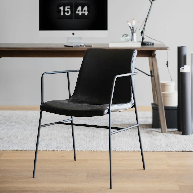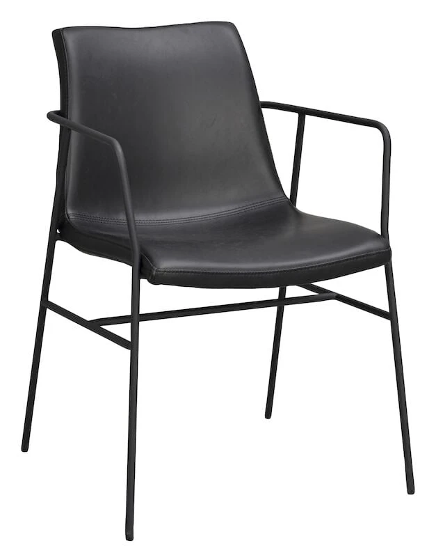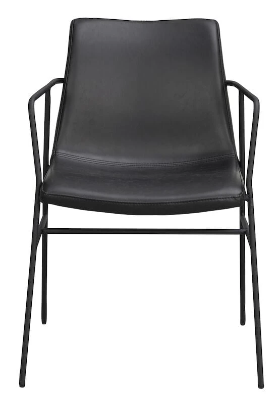 Tyylikäs ja moderni käsinojallinen tuoli ruokapöytään tai lisäistuimeksi olohuoneeseen. Paksuhkot metallijalat tekevät tuolista tukevan, mutta ilmavan näköisen. Näyttävä tikkaus viimeistelee keinonahkaisen istuinosan.
