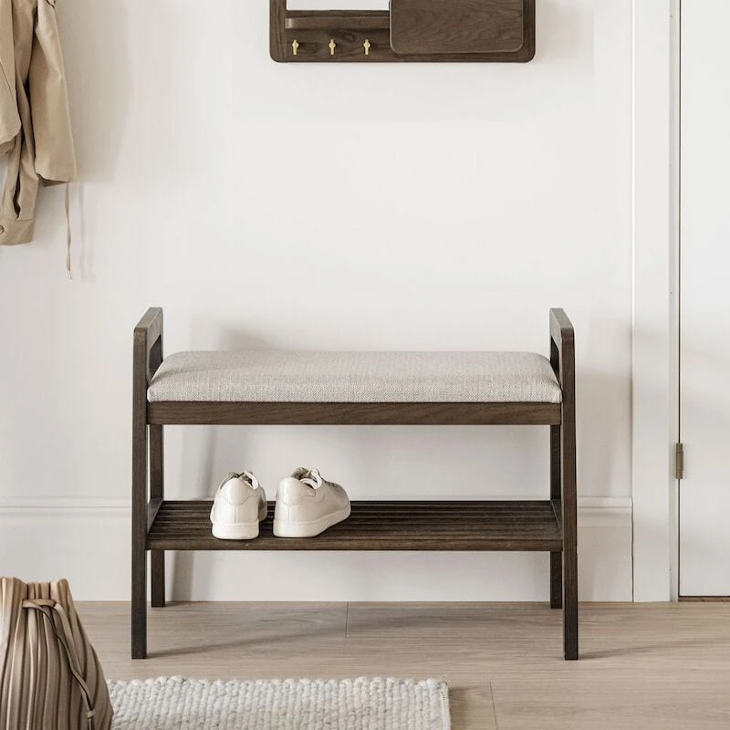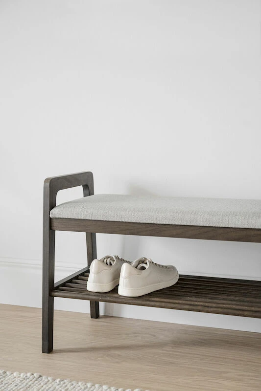 Laadukas ja sisustuksellinen massiivitammesta valmistettu Rowico Inverness eteispenkki kenkätelineellä kodin eteistiloihin. Eteispenkissä on yksi hylly ja ja hyvä istuin kangasverhoiltuna. Penkki sopii hyvin myös makuuhuoneeseen ja vaatehuoneeseen.