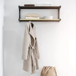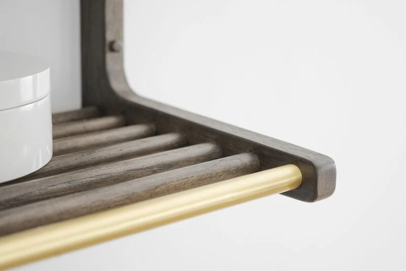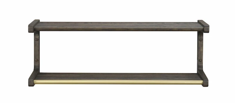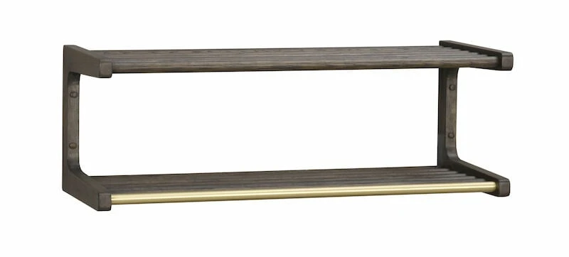 Klassisesti muotoiltu leveä hattuhylly eteiseen. Yksityiskohtana messingin värinen tanko, johon voi ripustaa takit hengareissa tai koukuissa. Hattuhylly kiinnitetään seinälle ruuvien avulla.