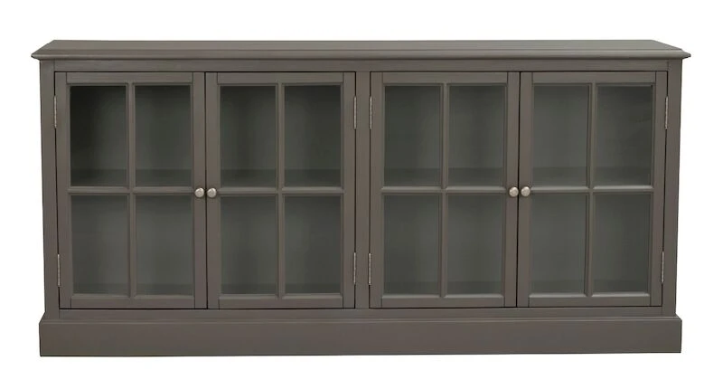 Rowico Lorient senkki on muotoilultaan kauniin klassinen. Lasiovien takana reilusti säilytystilaa esimerkiksi koriste-esineille ja kirjoille. Materiaalina mänty.