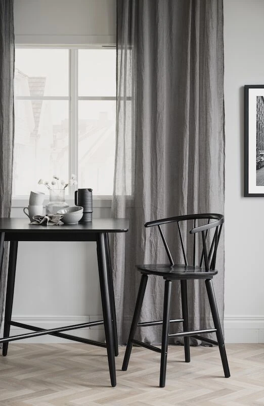 Kaunis ja klassisen tyylikäs Rowico Lotta baaripöytä on sopii pieneenkin ruokailutilaan. Pöydän kansi on saarniviilutettu MDF ja jalat massiivipuuta (Hevea). Lakattu pöydän kansi on helppo pitää puhtaana. Kauniit mustaksi maalatut pyöreät puujalat viimeistelevät pöydän ilmeen.