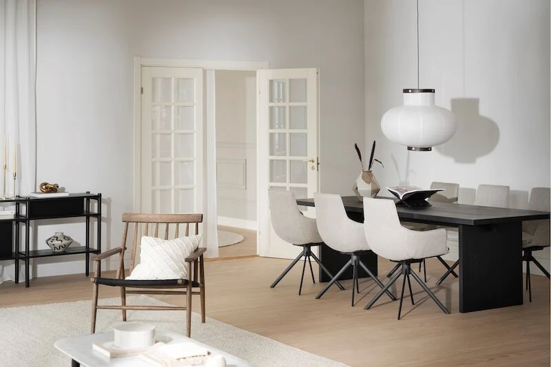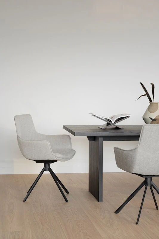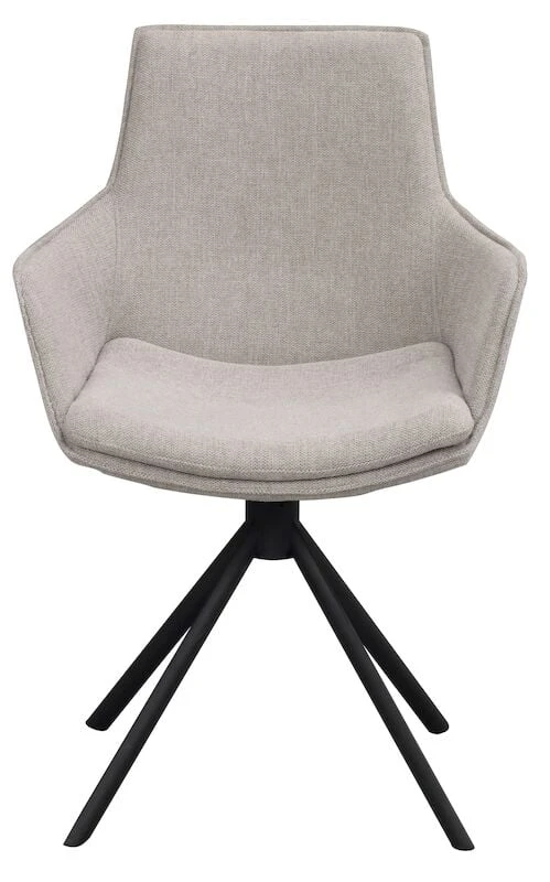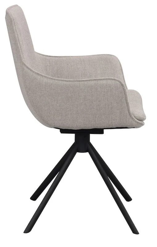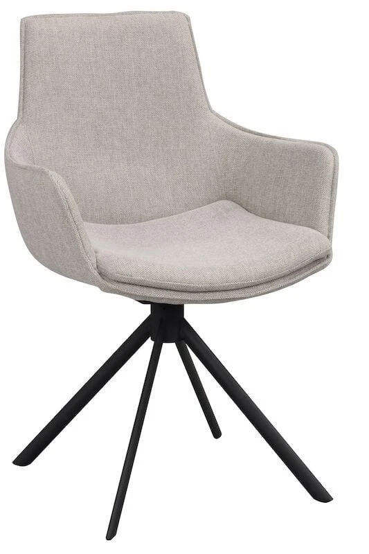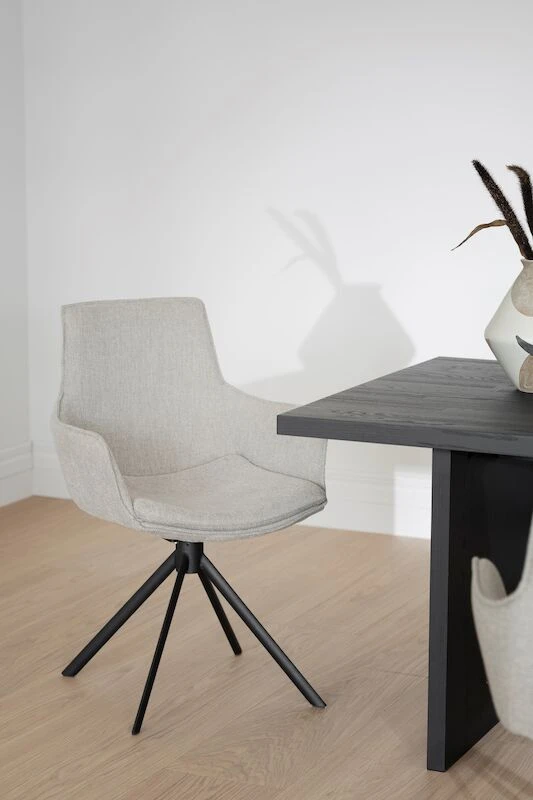 Trendikäs ja tyylikäs Rowicon Lowell pyörivä tuoli käsinojilla on korkealaatuinen ja todella hyvällä istuttavuudella. Käsinojatuolin istuinosa on pehmustettu ja verhoiltu kankaalla joka on helppohoitoista ja hyvin kulutusta kestävää. Tuolissa on tukeva mustaksi pulverimaalattu metallijalka ja se sisältää pyörintämekanismin. Todella käytännöllinen ja laadukas ruokapöydän tuoli, joka on helposti yhdistettävissä erilaisiin pöytiin.