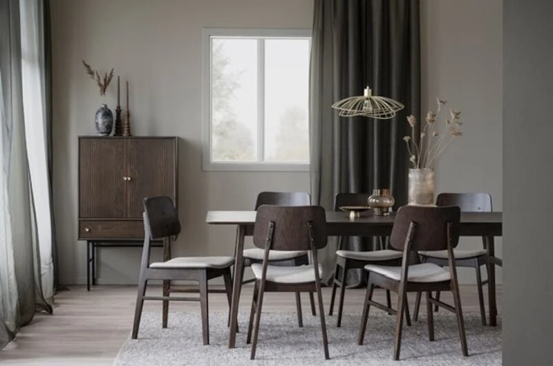 Moderni Rowico Nagano tuoli. Tuolissa on kaunis, kaareva muotoilu ja pehmustettu istuinosa. Materiaalina tammi, istuinosan kangas 100% polyesteriä. Kankaan martindale on 30000. Tuoli on helppo yhdistää eri tyylisten ruokapöytien kanssa, se sopii hyvin yhteen niin puun, metallin kuin lasin kanssa.