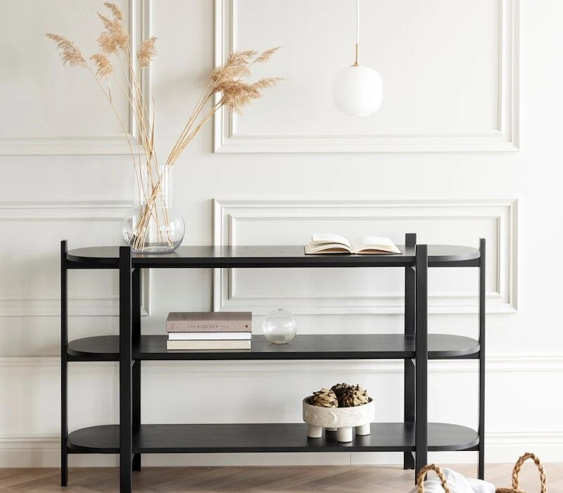 Rowico Tolsona, koossa 144×39 cm on käytännöllinen ja tyylikäs mustaksi lakattu konsolipöytä pyöristetyillä kulmilla. Hylly sopii täydellisesti eteiseen, makuuhuoneeseen tai olohuoneeseen. Tolsona-konsolipöydissä on kuusi kiinteää jalkaa, jotka tekevät niistä vakaan ja antavat sille ainutlaatuisen ilmeen. Tämä pöytä on valmistettu 100% FSC®-sertifioidusta puusta.
