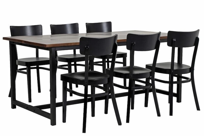 Tyylikäs Detroit-Cafe ruokailuryhmä 6-hengelle. Rouhean kaunis ja countryhenkinen Detroit ruokapöydän taso on mangopuuta, jalat mustaksi maalattua metallia. Pöytä on tukeva ja laadukas. Pöytä valmistetaan käsin, jonka vuoksi siinä voi olla pieniä mittaeroja, halkeamia ja epätaisuuksia. Nämä ominaisuudet tekevät tuotteesta uniikin. Pyökistä valmistettu, kaunis ja ajaton Cafe tuoli on kestävä ja omaa ajattoman muotoilun. Tuoli on maalattu mustaksi.