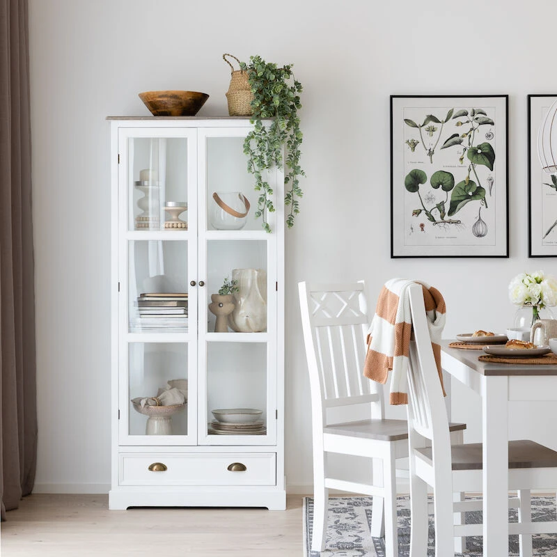 Rustiikkinen Sevilla vitriini kodin eri tiloihin antamaan reilusti lisää säilytystilaa. Sevilla tuotesarjasta löydät kotiin monenlaisia säilytyskalusteita, joiden värinä on upea valkoinen/ harmaa. Sevilla tuotteet tuovat kotiin ihanan romanttisen tunnelman.