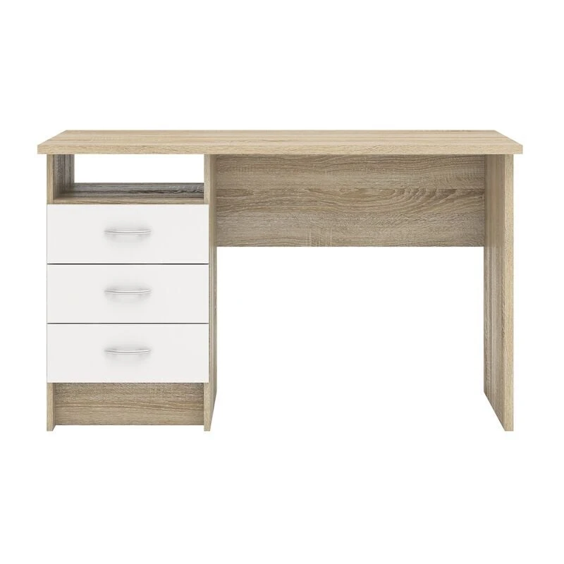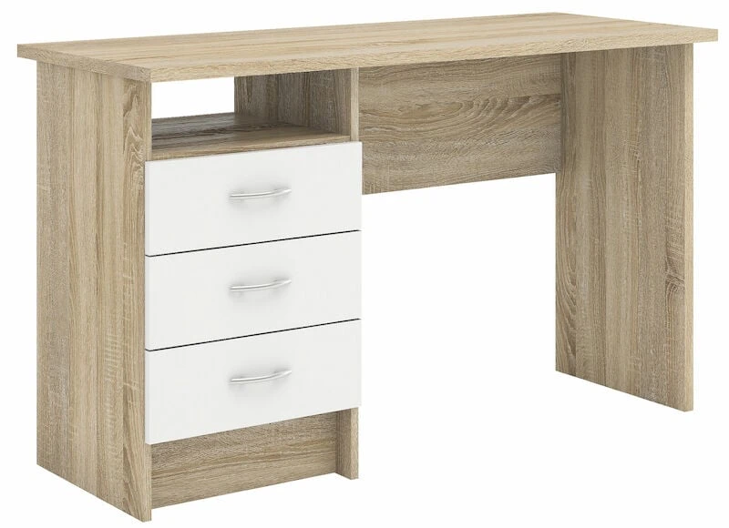 Kompakti Anni koulupöytä. Materiaalina kalustelevy. Värivaihtoehtoina valkoinen ja valkoinen/tammi. Pöydässä on mukavasti säilytystilaa avohyllyn ja kolmen laatikon ansiosta. Laatikoissa on kuulalaakeroidut liukukiskot.