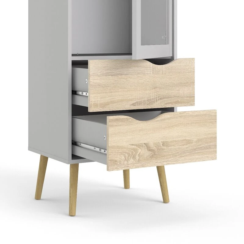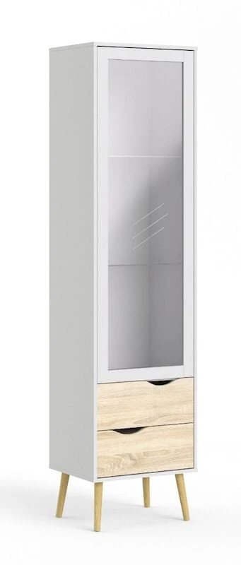 Kaunis Delta vitriini korkeilla tammijaloilla. Materiaalina on valkoinen kalustelevy. Vitriinin yläosassa on lasiovi, jonka takana on kolme säädettävää 0,4 cm paksua lasihyllyä ja alaosassa kaksi laatikkoa metallisilla liukukiskoilla.