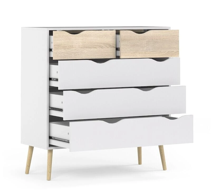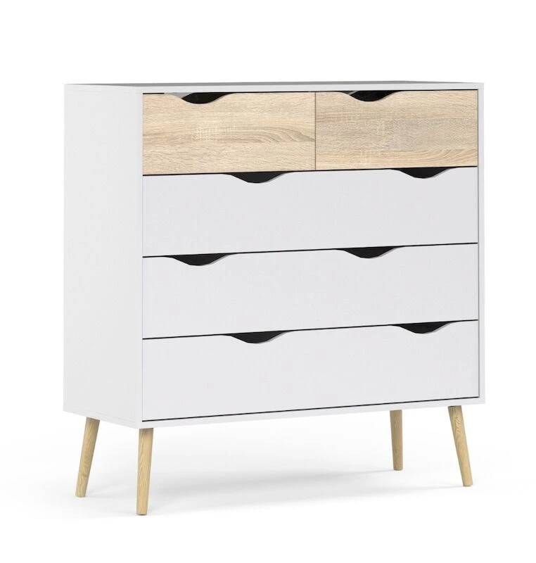 Kaunis lipasto jossa viisi hyvin aukeavaa laatikkoa. Värivaihtoehtoina musta/tammi ja valkoinen/tammi. Laatikoissa laakeroidut kiskot. Materiaalina pinnoitettu kalustelevy. Jalat tammea.