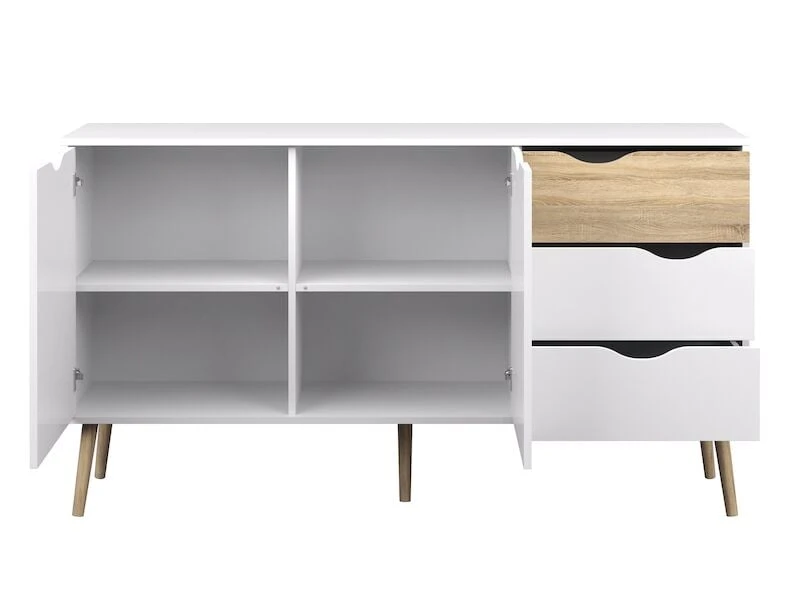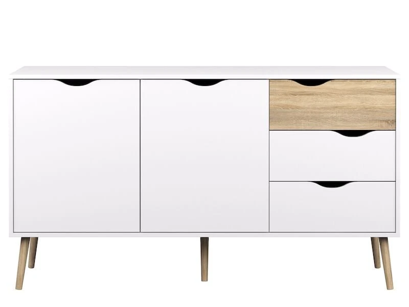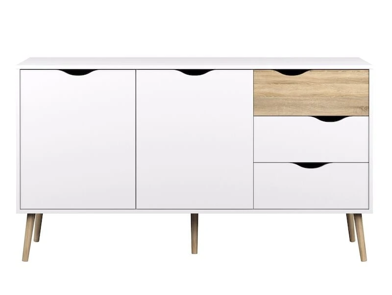 Moderni Delta senkki runsaalla säilytystilalla. Materiaalina valkoinen kalustelevy, korkeat tammijalat. Senkissä on kaksi ovellista kaappia ja kolme laatikkoa. Monikäyttöisen senkin voi sijoittaa kodin useisiin eri tiloihin.
