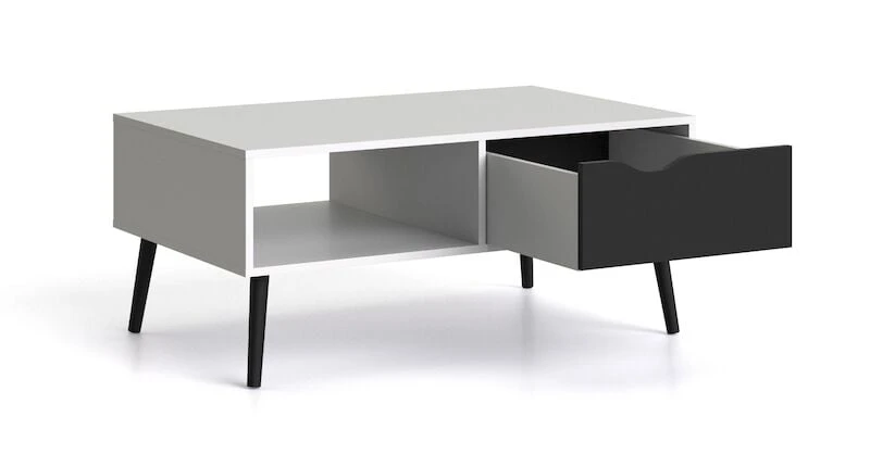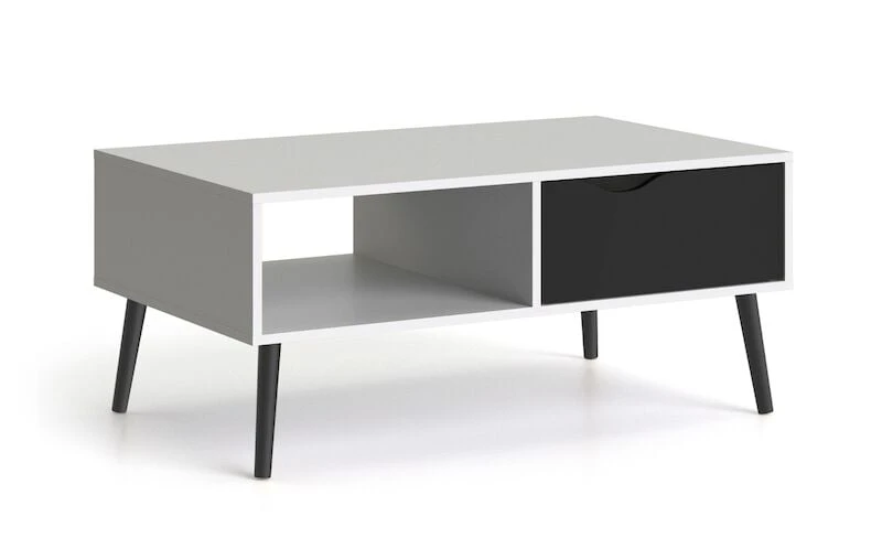 Kaunis ja käytännöllinen Delta sohvapöytä avohyllyllä ja laatikolla. Materiaalina valkoinen kalustelevy. Sohvapöydässä on korkeat tammijalat, joka tekee pöydästä ilmavan ja siron. Jalkojen värivaihtoehtona musta ja tammi. Yksi laatikko, johon on valittavissa joko musta tai tammen värinen etuosa. Pöydän kantavuus on 30 kg ja laatikon kantavuus 5 kg.