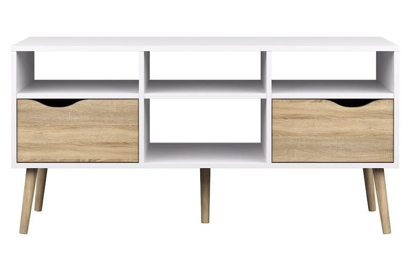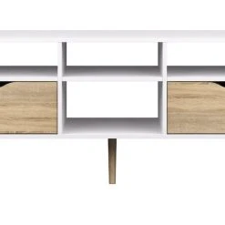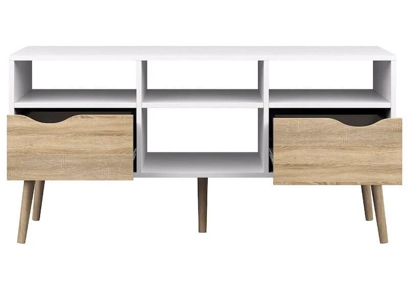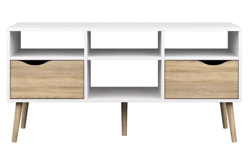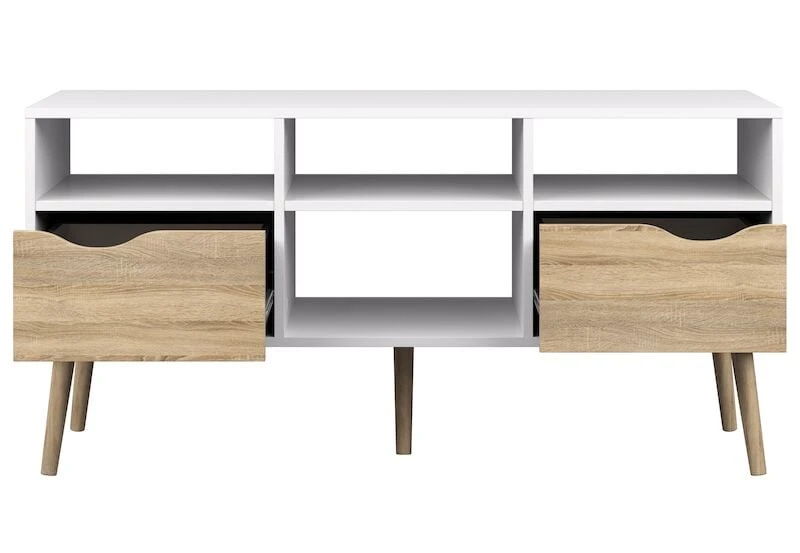 Kaunis Delta tv-taso. Materiaalina valkoinen kalustelevy. Korkeat tammijalat, värinä musta tai tammi. Tv-tasossa on neljä avohyllyä ja kaksi laatikkoa. Laatikot on valittavissa joko mustan tai tammen värisellä etuosalla.